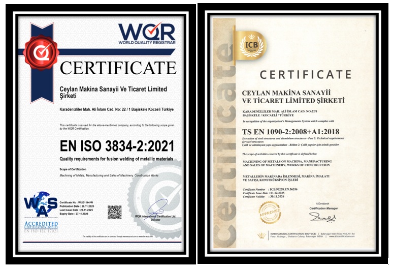 Şirketimiz, kalite yönetimi, iş sağlığı ve güvenliği, çevre yönetimi gibi konularda uluslararası standartları karşılayan sertifikalara sahiptir. Bu sertifikalar, işimizi her zaman en yüksek standartlarda yapmamızı ve müşterilerimize en iyi hizmeti sunmamızı sağlar. Kalite yönetimi konusunda, şirketimiz ISO 9001 standardına uygun olarak sertifikalandırılmıştır. Bu, iş süreçlerimizin sürekli olarak izlenmesi ve iyileştirilmesi sayesinde ürünlerimizin ve hizmetlerimizin müşteri memnuniyetini sağlaması anlamına gelir.